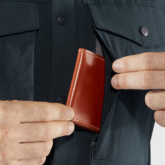 Dobbelte brystlommer med klapper, der både kan åbnes foroven eller i siderne med lodrette lynlåse og netfor – sidstnævnte kan også bruges som ventilationsåbninger.