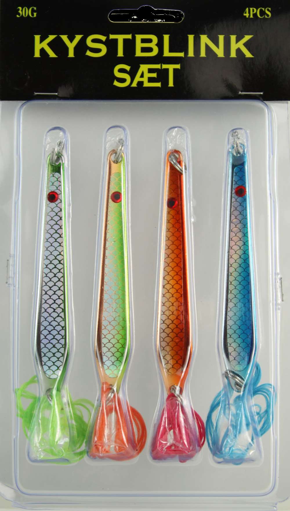 I den ene pakke er blinkene monteret med silketråd til hornfisk fiskeriet. I den anden pakke er blinkene monteret med 3 kroge.