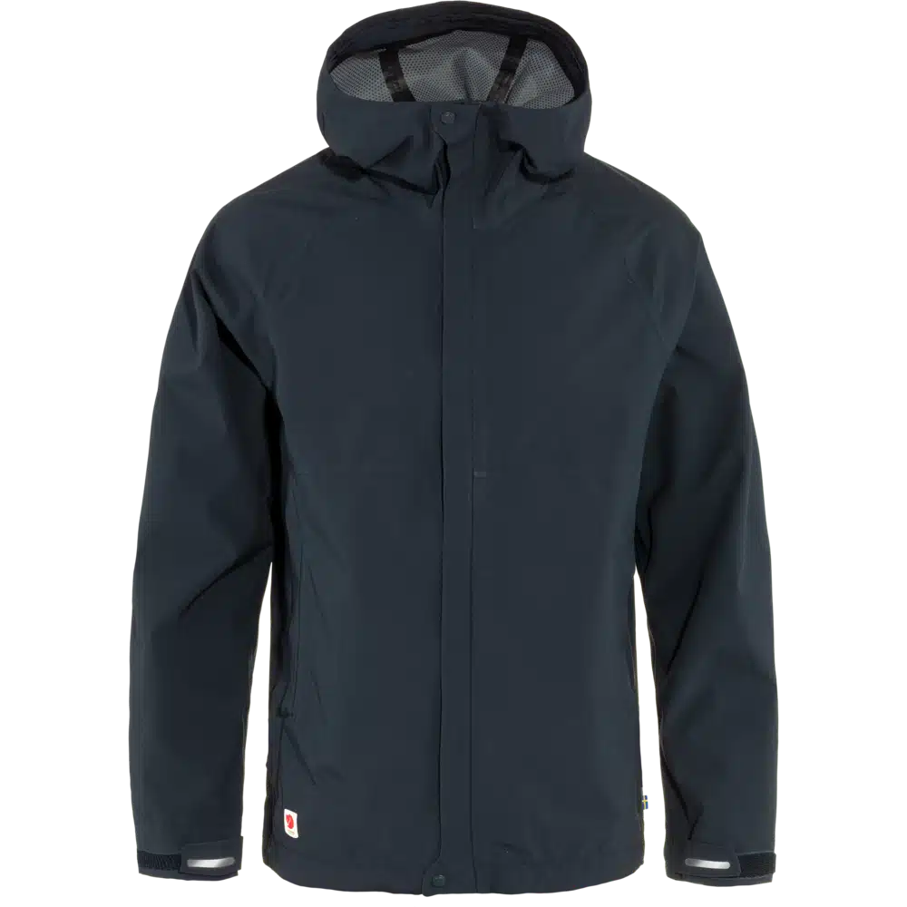 Fremstillet af genanvendt polyester med en PU-membran og PFC-fri imprægnering, har den en justerbar hætte, lynlåsventilationsåbninger i siderne og en tovejs lynlås foran med dobbelt placket.