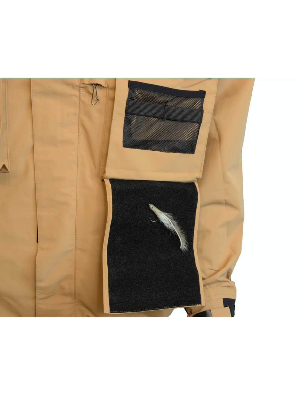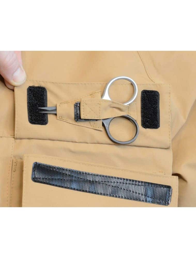 Denne vadejakke fra A. Jensen Fly Fishing er lavet med fokus på at alt skal kunne modstå saltvand. Derfor er der kun anvendt de bedste komponenter til vadejakken. Den er lavet med 2 store frontlommer, flue “skuffe”, 2 fleece lommer til at varme fingrene, 2 inderlommer med lynlås, stor lomme på ryggen til fx madpakken, D-ring til nettet, justérbar hætte og kajak-lukning på ærmerne. Rigtig lækker vadejakke, uanset om der skal fiskes i salt eller ferskvand.