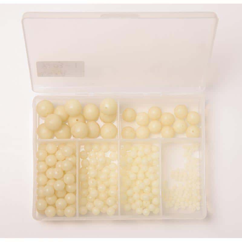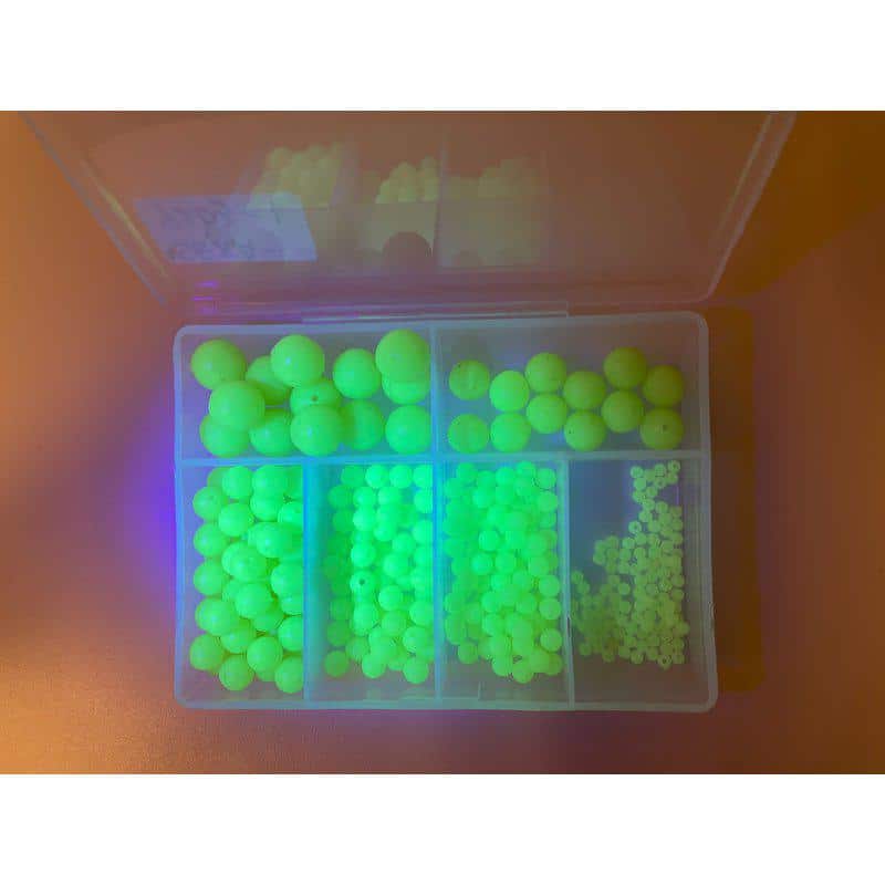 Fladen selvlysende bløde perler, er et sortiment på ca. 300 stk af kraftig selvlysende bløde perler i str 3 – 12 mm.
